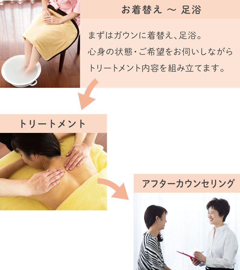 ★コース時間には、お着替え~足浴~カウンセリングの約30分も含まれます。
